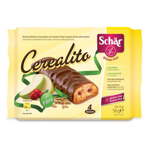 Vedi descrizione completaCerealito Schär Biscotto senza glutine con cereali e frutta ricoperto di cioccolato al latte.