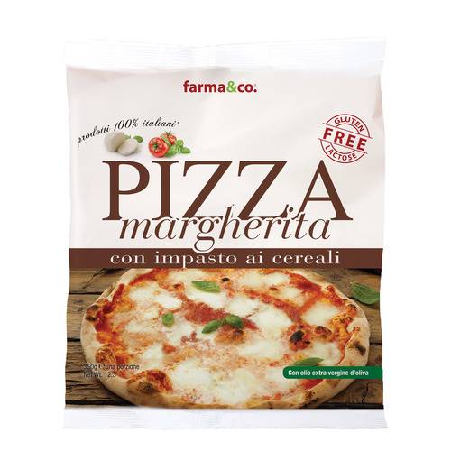 farma&co. PIZZA margherita con impasto ai cerealiDescrizione Pizza margherita con impasto ai cereali e olio extra-vergine di oliva. Prodotti 100% italiani (mozzarella e pomodoro). Prodotto da forno surgelato specificatamente formulato per i celiaci. Ingredienti Acqua, mozzarella 22% (latte delattosato, sale, caglio, fermenti lattici), amido di frumento deglutinato, polpa di pomodoro 21%, farina di riso 3%, olio extra vergine d’oliva 2%, latte in polvere delattosato, zucchero, lievito di birra, sale, amido di mais, olio di semi di girasole, fibra vegetale (psyllium, inulina di cicoria), farina di lenticchie rosse, addensante (gua...