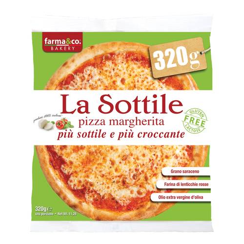 farma&co. La Sottile pizza margheritapiù sottile e più croccante Descrizione Pizza margherita, con olio extra vergine di oliva, grano saraceno e farina di lenticchie rosse. Prodotti 100% italiani (mozzarella e pomodoro). Prodotto da forno surgelato specificatamente formulato per i celiaci. Ingredienti Acqua, mozzarella 22% (latte delattosato, sale, caglio, fermenti lattici), polpa di pomodoro 21%, amido di frumento deglutinato, farina di riso, olio extra vergine d’oliva 2%, latte in polvere delattosato, zucchero, semi di lino, semi di girasole, lievito di birra, farina di lenticchie rosse 1%, farina di sorgo, farina di grano sar...